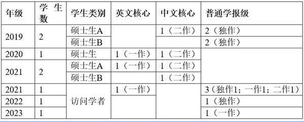 期刊论文 Zhang, Sihong & Chen, Jie. 2024. A typological study on person sensitivity in Ersu. Asian Language and Linguistics. 5.2:337-357.(源期刊高水平论文;通讯作者) Dong, Liying, Wang Yalan & Zhang, Sihong. 2024. Multilingualism in the Andes: policies, politics, power. Journal of Language and Politics. DOI: 10.1075/jlp.24053.don(源期刊高水平论文;通讯作者) Liu, Yifan & Zhang, Sihong. 2023. The essence of linguistic analysis, an integrated approach. Folia Linguistica. DOI:10.1515/flin-2023-2005(源期刊高水平论文;通讯作者) Mei, Shuqi, Wang Yalan & Zhang, Sihong. 2023. English in East and South Asia: policy, features and language in use. Journal of Multilingual and Multicultural Development. DOI:10.1080/01434632.2023.2168931(源期刊高水平论文;通讯作者) Wang, Jing & Zhang, Sihong. 2022. Cross-cultural learning: a visualized bibliometric analysis based on Bibliometrix from 2002 to 2021. Mobile Information System. https://doi.org/10.1155/2022/7478223. (源期刊高水平论文) Liu, Suya & Zhang, Sihong. 2021. A bibliometric analysis of computer-assisted English learning from 2001 to 2020. International Journal of Emerging Technologies in Learning. 16.14:12-27. (源期刊高水平论文;通讯作者) Zhang, Shuyu & Zhang, Sihong. 2019. Experimental study on a two-string lexical decision task: non-words and words. iJES. 7.4:77-84. Zhang, Sihong. 2016. Mobile college English teaching: an empirical study on an APP, English Fun Dubbing. iJET. 15.1:1-8. (源期刊高水平论文) Zhang, Sihong. 2014. Numeral classifiers in Ersu. Language and Linguistics. 15.6: 883-915.(源期刊高水平论文) 张四红,梅书琪. 2023. RCEP区域伙伴国家语言安全建设的实践路径[J]. 当代外语研究 54-64. (源期刊高水平论文) 张四红,胡爽. 2023. RCEP框架下的我国外语高等教育:现状分析与路径优化[J]. 外语学刊16-24. (源期刊高水平论文) 张四红,耿静静. 2023. 总体国家安全观视域下的边疆和谐语言生活构建[J]. 北京第二bwin必赢中国官网学报 172-173. (源期刊高水平论文) 张四红,江榕,李梦媛,吴纪琛. 2023. 新中国成立以来我国外语教育政策与文化自信的互动研究[J]. 语言政策与规划研究 47-56+178-179. (源期刊高水平论文) 张四红,解丽丽. 2022. 尼泊尔的藏裔族群及藏语方言研究[J]. 中国藏学. 155.6:161-173+219.(源期刊高水平论文) 张四红,董理颖. 2022. 印度尼西亚国际中文教育的本土化路径研究[J]. 云南师范大学学报(对外汉语教学与研究版).20.6:9-18.(AMI扩展版期刊论文) 张四红,刘一凡. 2021. 中国与周边“一带一路”沿线国家的跨境语言类型及治理[J]. 云南师范大学学报(哲学社会科学版). 53.3:95-103.(源期刊高水平论文) 张四红. 2020. 尼泊尔的语言国情及中国西藏边境地带语言安全构建[J]. 南亚研究. 2020.3:39-58+157.(源期刊高水平论文) 张四红. 2020. 中国周边跨境语言研究国际学术话语权的构建[J]. 语言文字应用. 2020.2:27-36.(源期刊高水平论文) 张四红. 2020. 语言服务于国家应急管理的基础性作用研究[J]. 宿州学院学报. 35.6:40-42. 张四红. 2019. 沉浸田野矢志不渝,痴迷语言著述等身——澳大利亚詹姆斯·库克大学语言与文化研究中心R. M. W Dixon教授访谈录[J]. 常熟理工学院学报. 2019.6:79-84. 张四红, 孙宏开,王德和.2018. 尔苏语形容词的词类独立性研究[J].语言研究,38.1:107-117.(源期刊高水平论文;《中国社会科学网》全文转载) 张四红,余成林. 2017. 尔苏语的存在类和领有类动词及其类型学启示[J].民族语文,2017.3:53-67. (源期刊高水平论文) 张四红, 王轩.2017. 越西尔苏语以动词为基式的重叠式研究[J].中央民族大学学报(哲学社会科学版),44.2:163-169. (源期刊高水平论文) 张四红等. 2017. 互联网+时代的中医药跨文化传播[J]. 时珍国医国药,28.5:1277-1280. (源期刊高水平论文) 张四红. 2017. 基于对等沟通理论的英语混合式教学研究[J]. 重庆科技学院学报(人文社会科学版),2017.3:103-106. 张四红等. 2016. 中医药大学内涵建设和国际化战略[J]. 淮北师范大学学报(哲学社会科学版),37.3:129-132. 张四红,程玲. 2011. 基于Multi-Conc的英语词汇自主学习研究[J]. 现代教育技术,21.8:60-65.(源期刊高水平论文) 张四红等. 2011.基于AntConc的英语词汇教学研究——以《大学英语(精读)》课文文本为例[J]. 长江大学学报(社会科学版),34.12:93-96. 张四红. 2010. 农村大学生英语听力状况的调查研究[J]. 教育理论与实践,30.3:52-54.(源期刊高水平论文) 学生指导相关要求 课题组计划每年招收青年访问学者0-1名,学术型硕士和翻译专业型硕士各1-2名。建议青年访问学者和学术型硕士从事语言类型学和语言政策与规划方面的研究,建议翻译专业型硕士合作(或独立)翻译一本中文或英文专著,同时也鼓励学生结合自身研究兴趣进行自由探索,敬请提前通过邮件联系商谈学习方向和计划。 学生学术成果统计 结束访学青年访问学者以及已毕业学术型硕士在学期间学术成果统计: