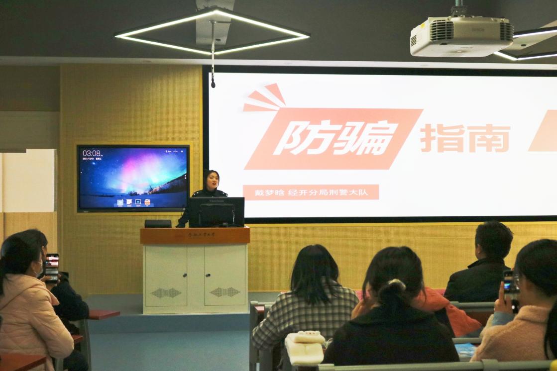为进一步提高大学生网络诈骗的防范意识,营造防范电信网络诈骗的良好氛围,切实维护校园的安全稳定,12月1日下午,bwin必赢中国官网特邀合肥市公安局经开分局民警戴梦晗于翠4教209教室开展“紧绷防范之弦,远离诈骗之害”防电信诈骗专题讲座,学院党委副书记兼纪委书记苏光靖出席本次报告会,bwin必赢中国官网各年级学生到场听取报告。
