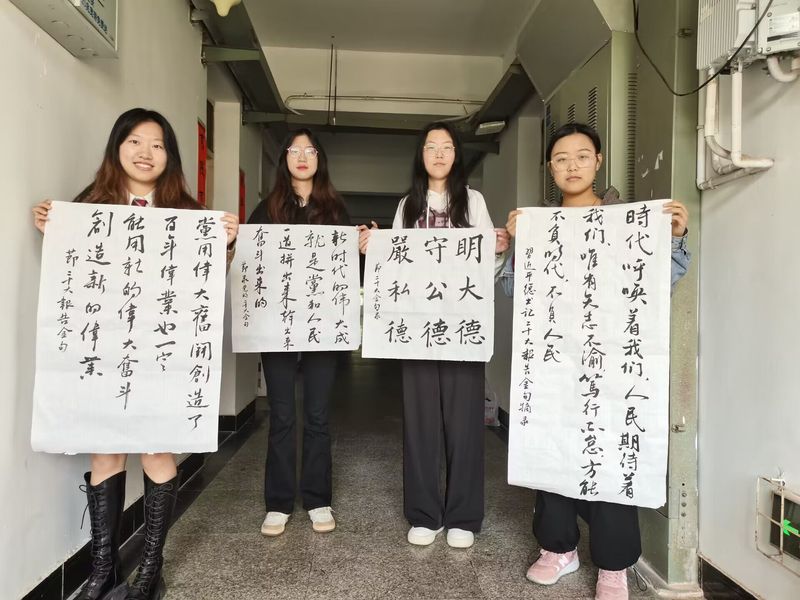 “明大德 守公德 严私德”“时代呼唤着我们,人民期待着我们,唯有矢志不渝笃行不怠,方能不负时代不负人民”……不一会儿,一幅幅书法作品跃然纸上。尽管学生们的写作功底还不成熟,却饱含着对书法的热爱和对祖国的深厚情感。