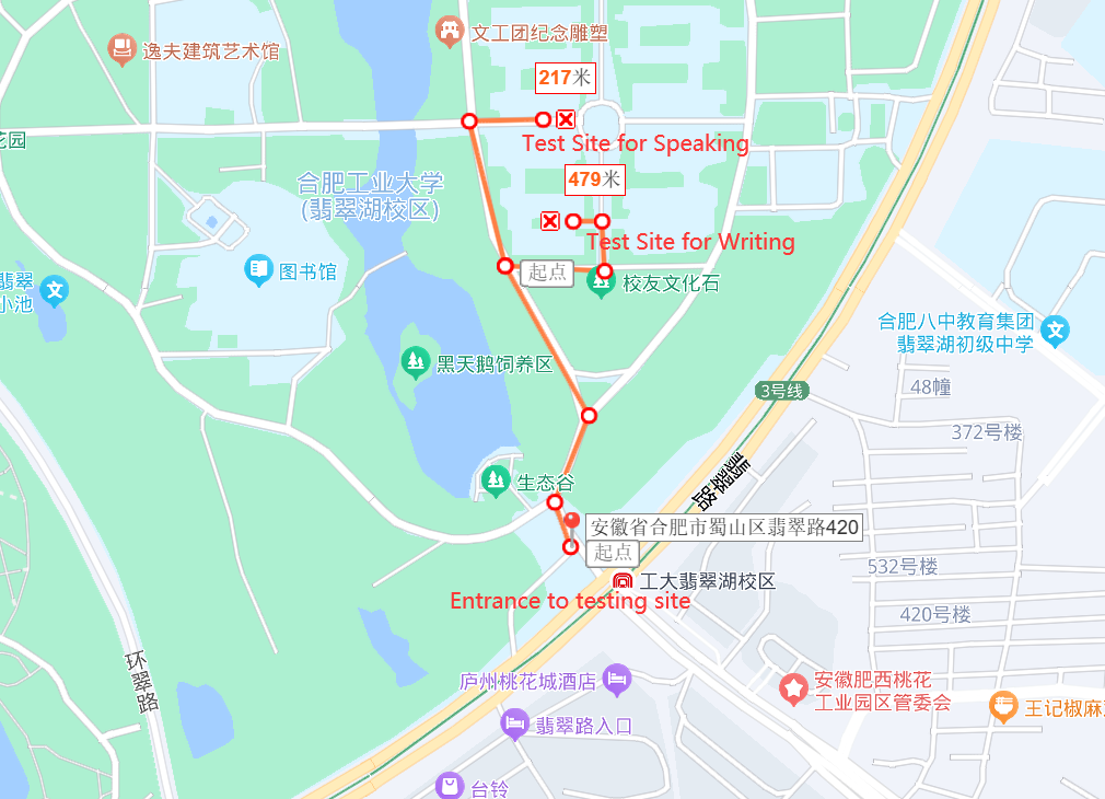 The written test venue is located at Lecture Building 4 and speaking test at Lecture Building 8 . Candidates should enter HFUT on the test day from the South Gate of the university, on No. 420,Feicui Rd,Shushan District, Hefei City. You may seek help from our volunteers if you have any questions and you can also follow the test signs along the road after entering the university.