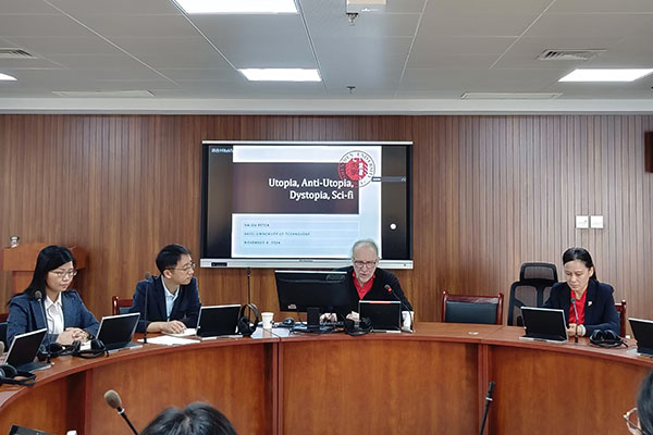 2024年11月4日上午,bwin必赢中国官网在翡翠湖校区科教楼A座1203教室举办了“2024年斛兵外语讲坛‘科研产出大家说’暨研究生交流年会第五场学术报告”。深圳大学特聘教授彼得·海居(Peter Hajdu)应邀为学院师生作题为“Utopia, Anti-Utopia, Dystopia, Sci-fi”的主旨报告。